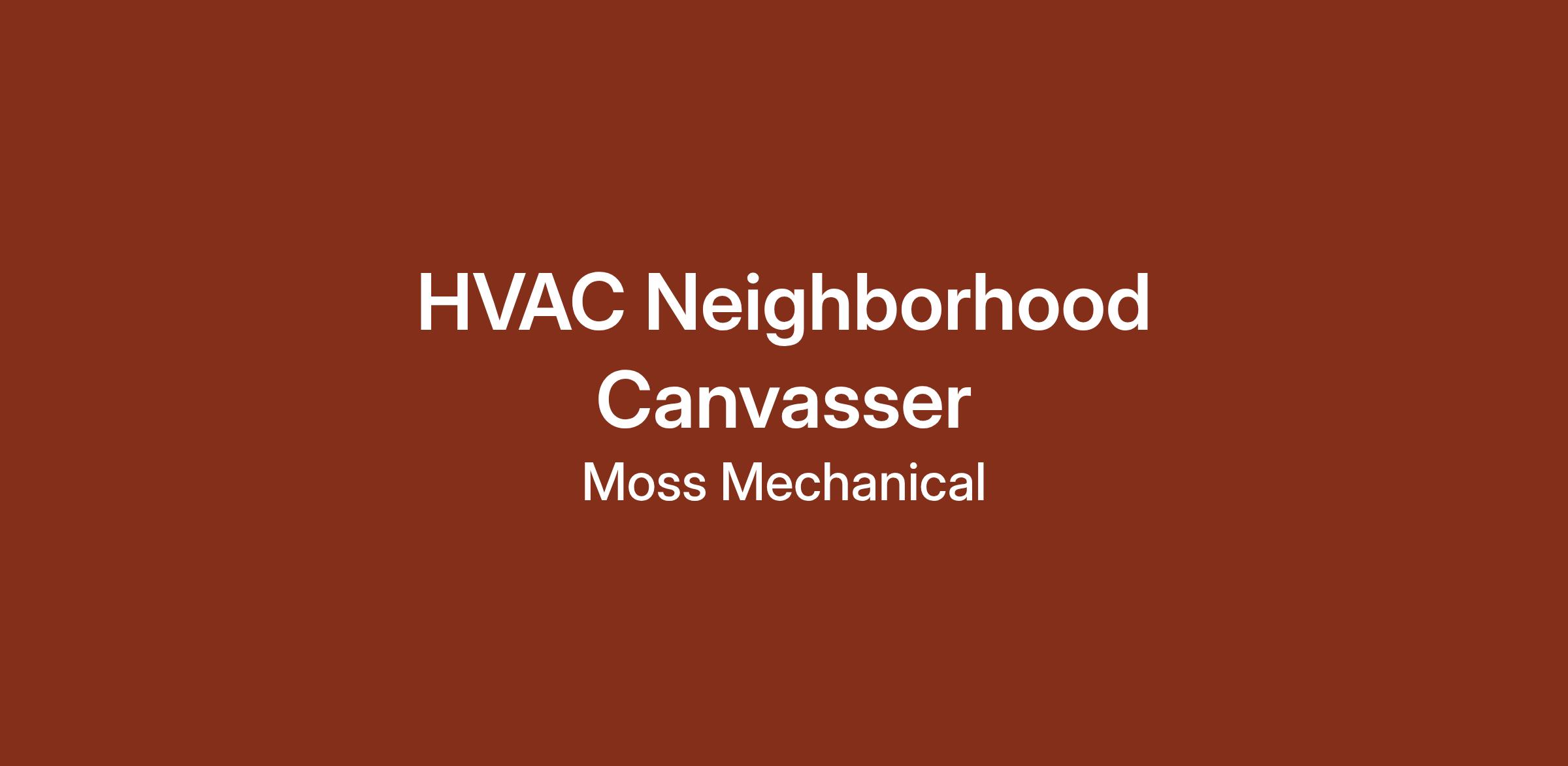 Job Title: HVAC Neighborhood Canvasser Company: Moss Heating and Cooling Location: Dallas, Texas Job Type: Part-Time or Full-Time Compensation: Hourly + Bonus (Based on Leads/Appointments Set) Schedule: Flexible, Primarily Afternoons/Evenings and WeekendsAbout Us Moss Heating and Cooling is a trusted, locally owned HVAC company based in Dallas, Texas, dedicated to providing top-tier heating and cooling solutions to homeowners. With a focus on integrity, professionalism, and customer satisfaction, we take pride in serving our community and treating every home like our own.Job Overview We’re looking for a motivated, outgoing, and reliable individual to join our team as an HVAC Neighborhood Canvasser. In this role, you’ll represent Moss Heating and Cooling in local neighborhoods—engaging with residents, promoting our services, and generating interest in seasonal tune-ups, energy-efficient upgrades, and free consultations.Key Responsibilities