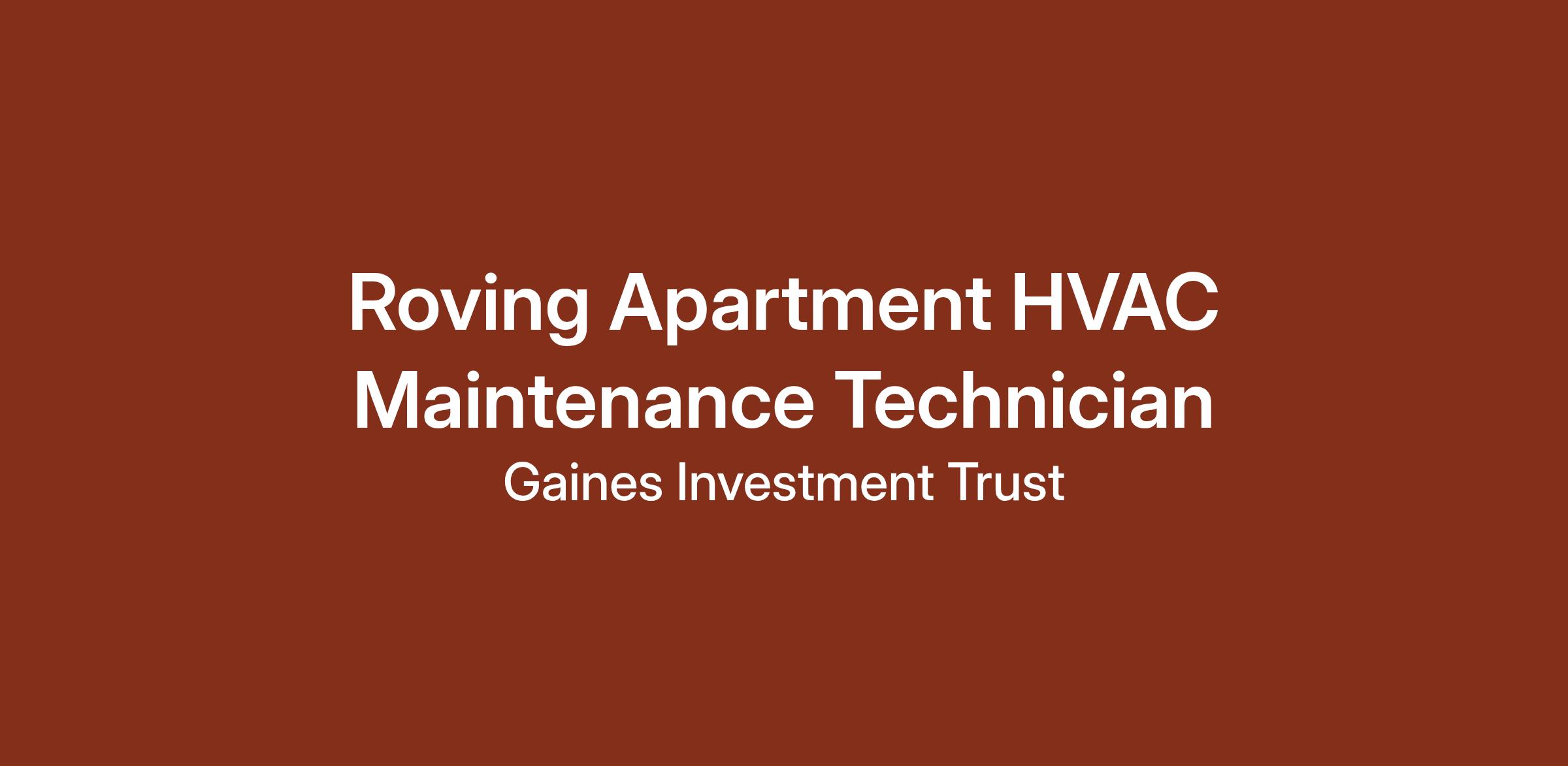 Gaines Investment Trust is hiring a Roving HVAC Maintenance Technician to support a portfolio of apartment communities in the Irving and North Dallas area. If you’re a hands-on, adaptable professional who enjoys variety in your workday and excels in delivering high-quality maintenance service, this is the role for you.
