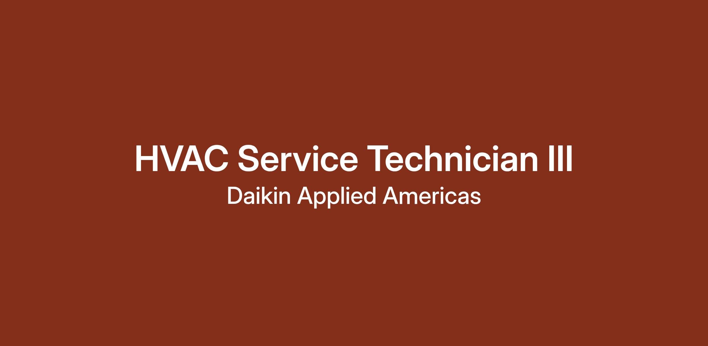 Daikin Applied is seeking a full-time HVAC Service Technician III. In this role, you will be responsible for diagnosing, repairing, and performing preventative maintenance for commercial and industrial HVAC equipment. The responsibilities will increase based on exposure to tasks, ability to develop troubleshooting skill set, and consistent and accurate completion of assignments. The HVAC equipment you will be servicing includes but is not limited to large and small rooftop units, split systems, chillers, and boilers. Come be a part of an exciting journey at Daikin Applied, where innovation and excellence drive our every endeavor!